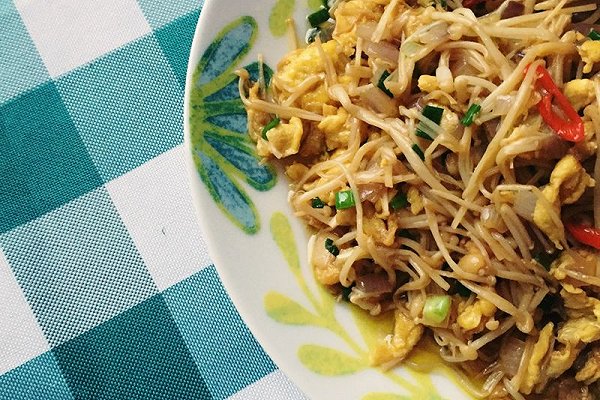 做法:金针菇去尾部洗净,鸡蛋加少许盐打散备用,热锅倒油烧热,金针菇比较吃油,所以可以比平时炒菜多些油,倒入蛋液翻炒,待炒得鸡蛋微微金黄时用锅铲把鸡蛋切成小块儿,鸡蛋切成小块儿后立刻倒入金针菇翻炒,加少许无糖酱油调味,随后加入小米辣,倒入葱花翻炒均匀即可起锅。