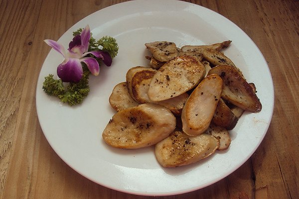 做法:杏鲍菇洗净切厚片,放入煎锅中,少油,煎出水分,出现金黄色,翻面煎另一面,同时撒盐和黑胡椒粉,煎入味,出锅摆盘即可。