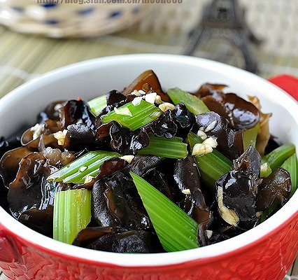 做法:黑木耳用冷水泡发,漂洗干净摘去老根,西芹掰开洗净,把老筋刮去,锅中放水烧开,西芹焯水大约一两分钟即可,捞出浸入冷水中,用焯西芹的水,继续把黑木耳焯下,大约三分钟捞出浸入冷水,西芹和黑木耳从冷水捞出沥干水分,西芹切小段,黑木耳撕成小朵,全部放入大盆中,放无糖酱油、醋各少许,香油一小勺,加入蒜末拌匀即可。