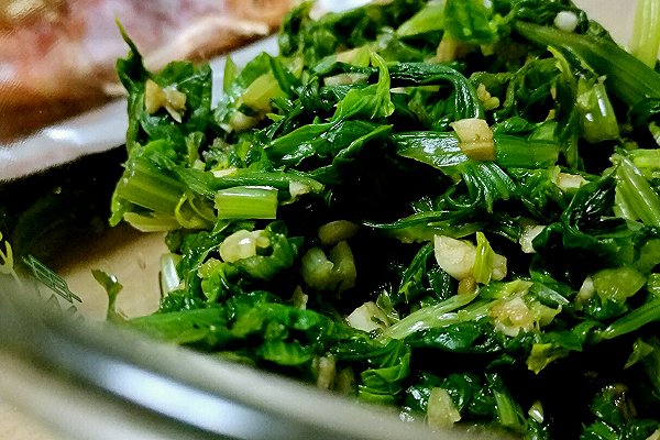做法:选新鲜绿色的叶子洗净备用,芹菜茎装保鲜袋,冷藏保存,随吃随取,芹菜叶开水焯烫,捞出沥干水分装盘,蒜切碎放入芹菜叶,加适量盐或无糖酱油,醋拌匀即可。