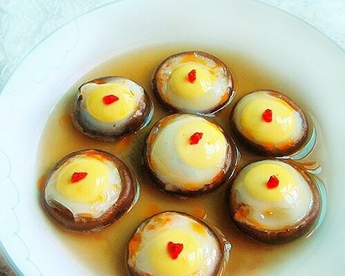 做法:将香菇去缔,(尽量剪深点,看上去有个小坑,这样蛋液不外流,蛋黄也会留在中间)洗净;将洗好的香菇放入碗内一定要滤干水分,这关系着菜品的相貌哦,每个香菇里面打进一个鹌鹑蛋,在摆好盘的香菇蛋上撒一些精盐,在盘中放一小勺植物油,放进锅里水开后蒸10分钟,蒸熟的香菇蛋上撒些无糖酱油,再蒸3分钟,然后舀一勺汤汁浇在每个香菇蛋上,(这样视觉效果好很多,也更入味)可以上桌了。